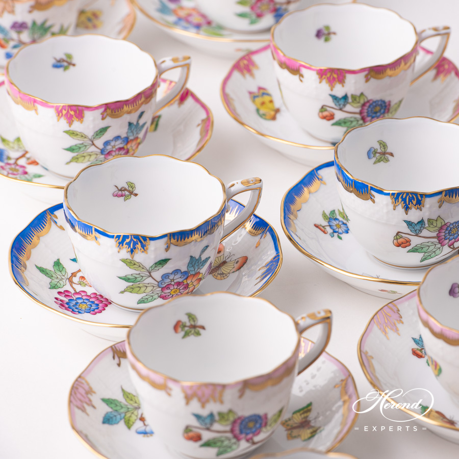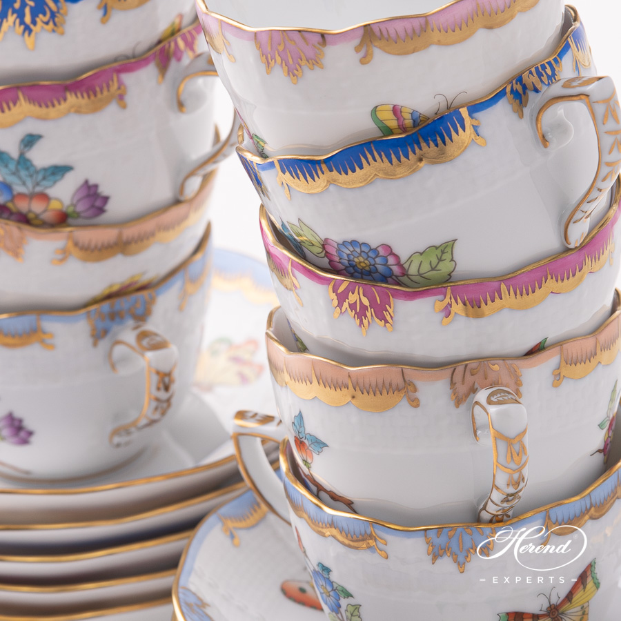 The Herend’s Queen Victoria-A Pink Edge design is painted with Peony Flowers and Butterflies. Queen Victoria – VBA pattern is available in Tea, Coffee, Espresso, and Dinner Sets.